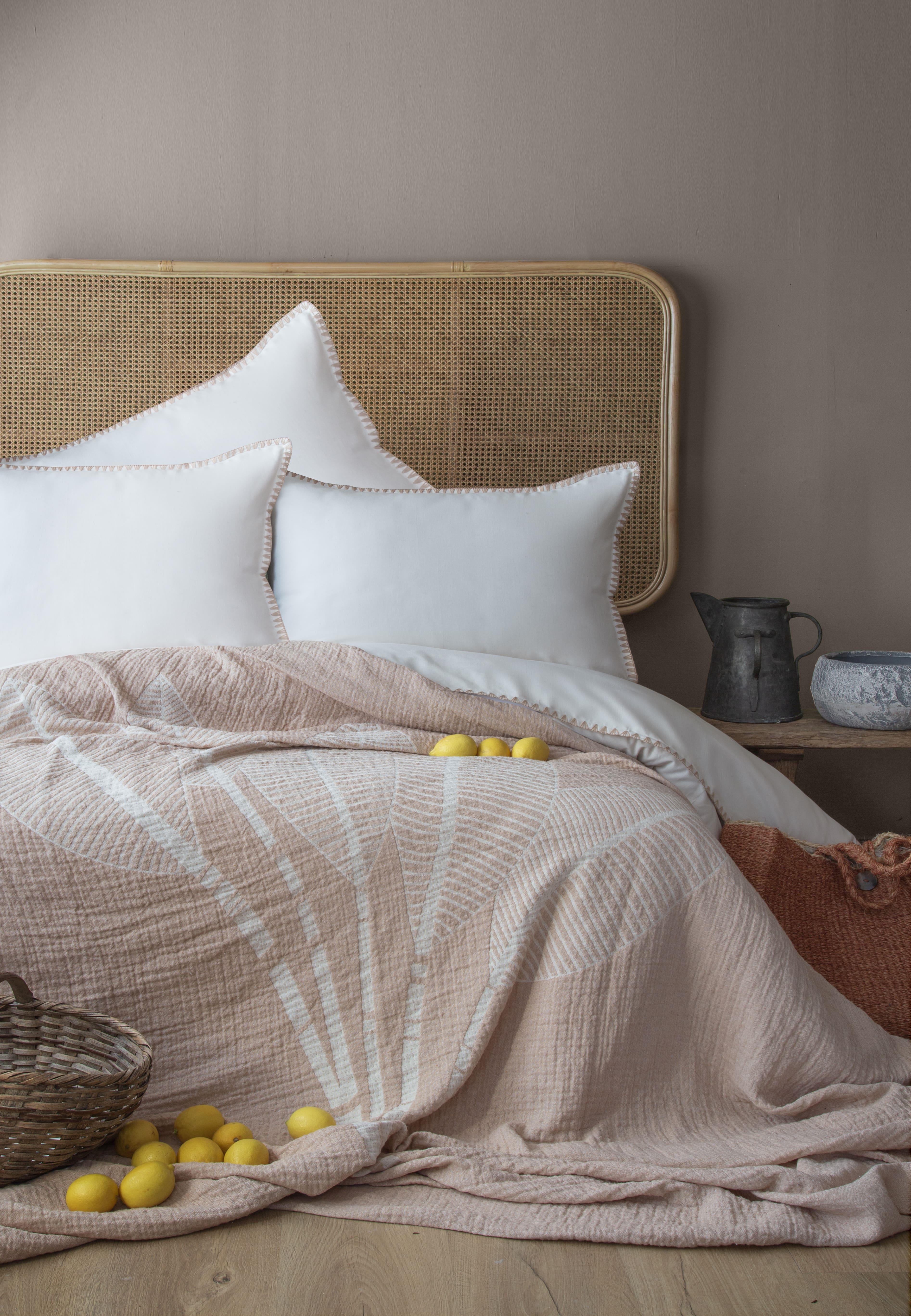 230×240 cm muslin yatak örtüsü – yatağınıza doğal ve estetik bir dokunuş 200×220 cm nevresim – çift kişilik standart ölçü 240×260 cm düz çarşaf – lastiksiz, ütü kolaylığı sağlar 2 adet 50×70 cm yastık kılıfı – setin tamamlayıcısı