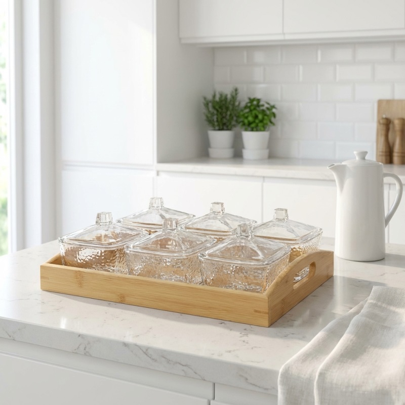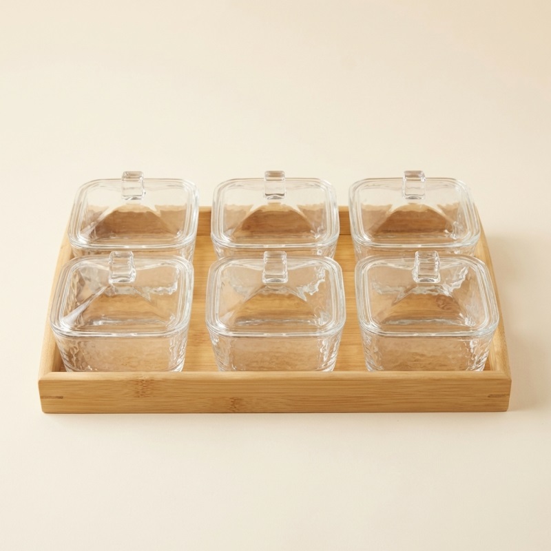 Gönül 6 Li Bambu Tepsili Cam Kahvaltilik / Çerezlik